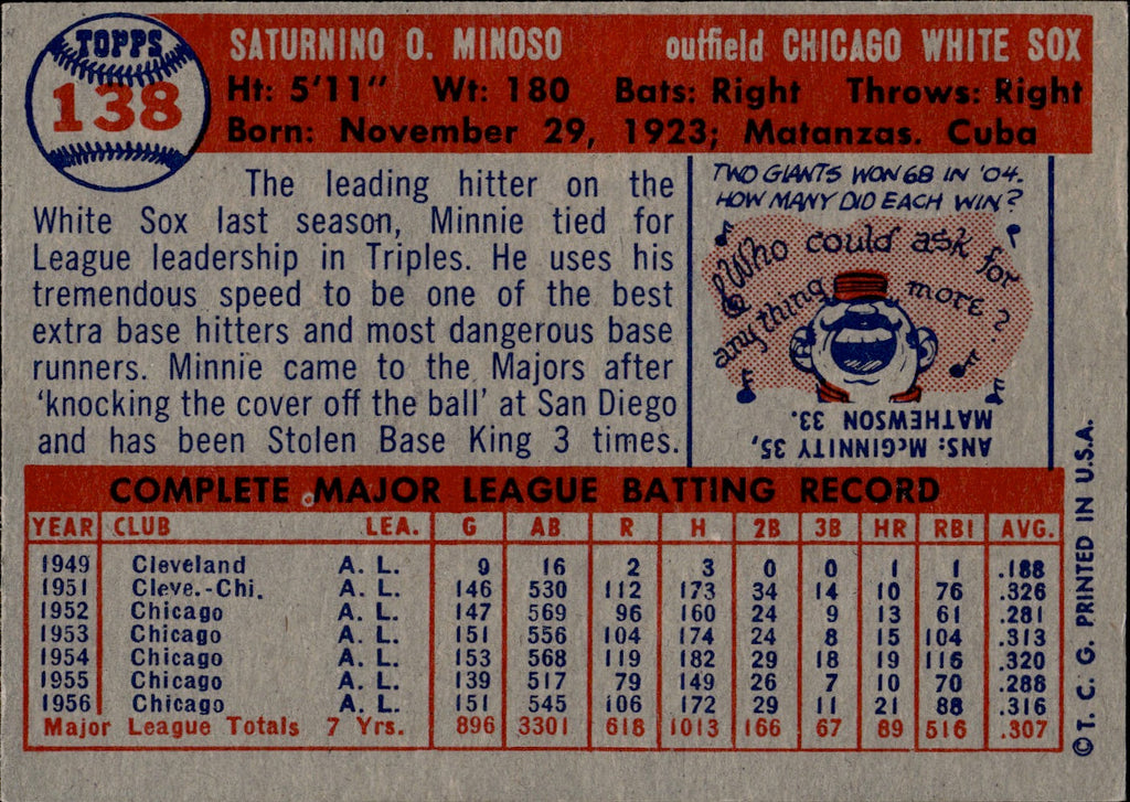 1957 Minnie Minoso Topps #138 Chicago White Sox BV$25