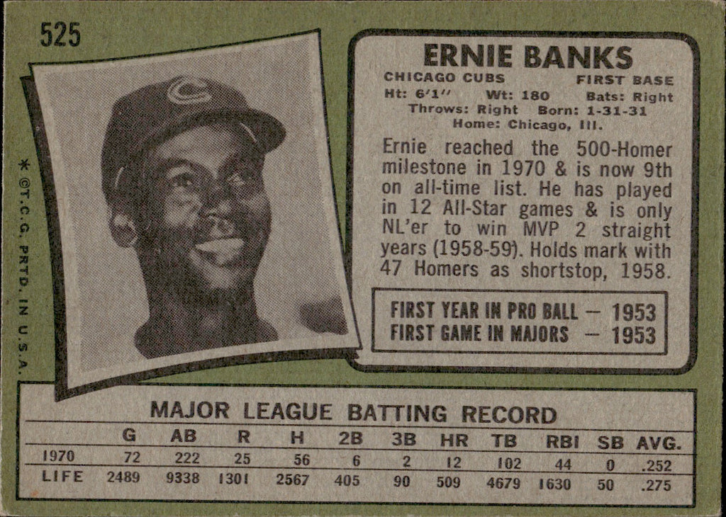 1971 Ernie Banks Topps #525 Chicago Cubs BV$150