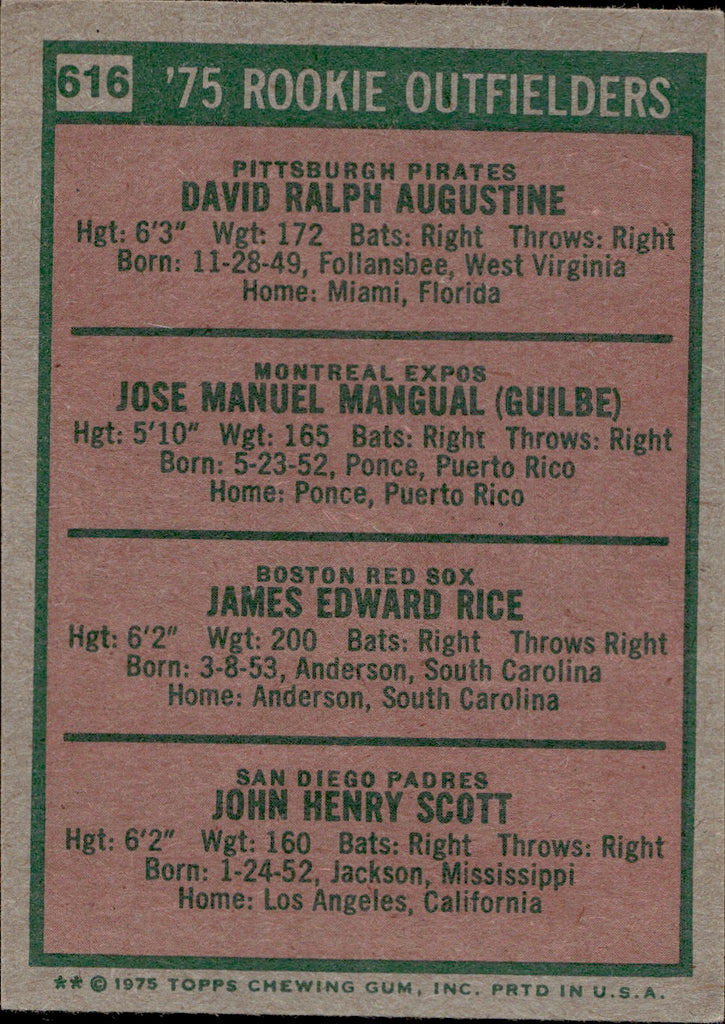 1975 Dave Augustine Pepe Mangual Jim Rice John Scott Topps ROOKIE RC #616 BV$50