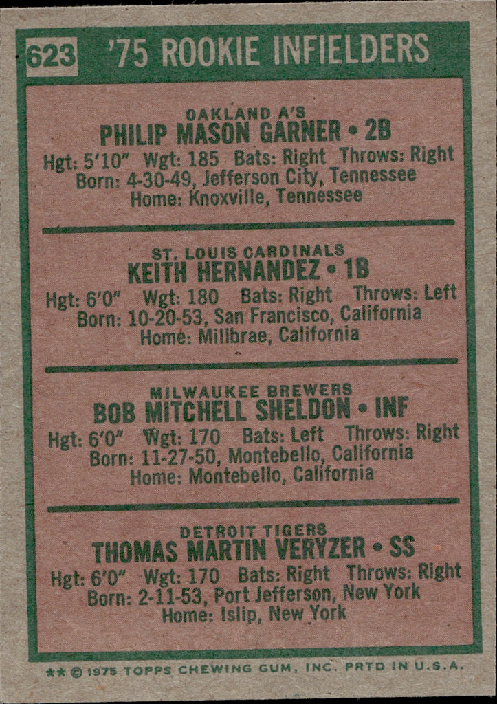 1975 Phil Garner Keith Hernandez Bob Sheldon Tom Veryzer ROOKIE RC Topps #623