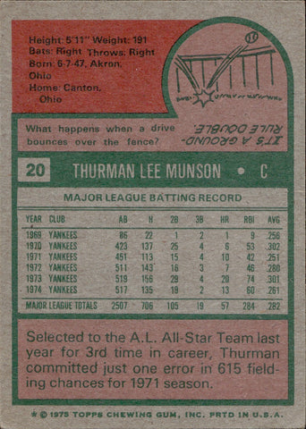 1975 Thurman Munson Topps #20 New York Yankees BV$50