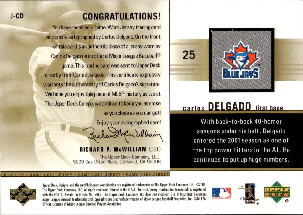 2002 Carlos Delgado Upper Deck GAME JERSEY AUTOGRAPH GOLD AUTO 5/25 Toronto Blue Jays #J-CD