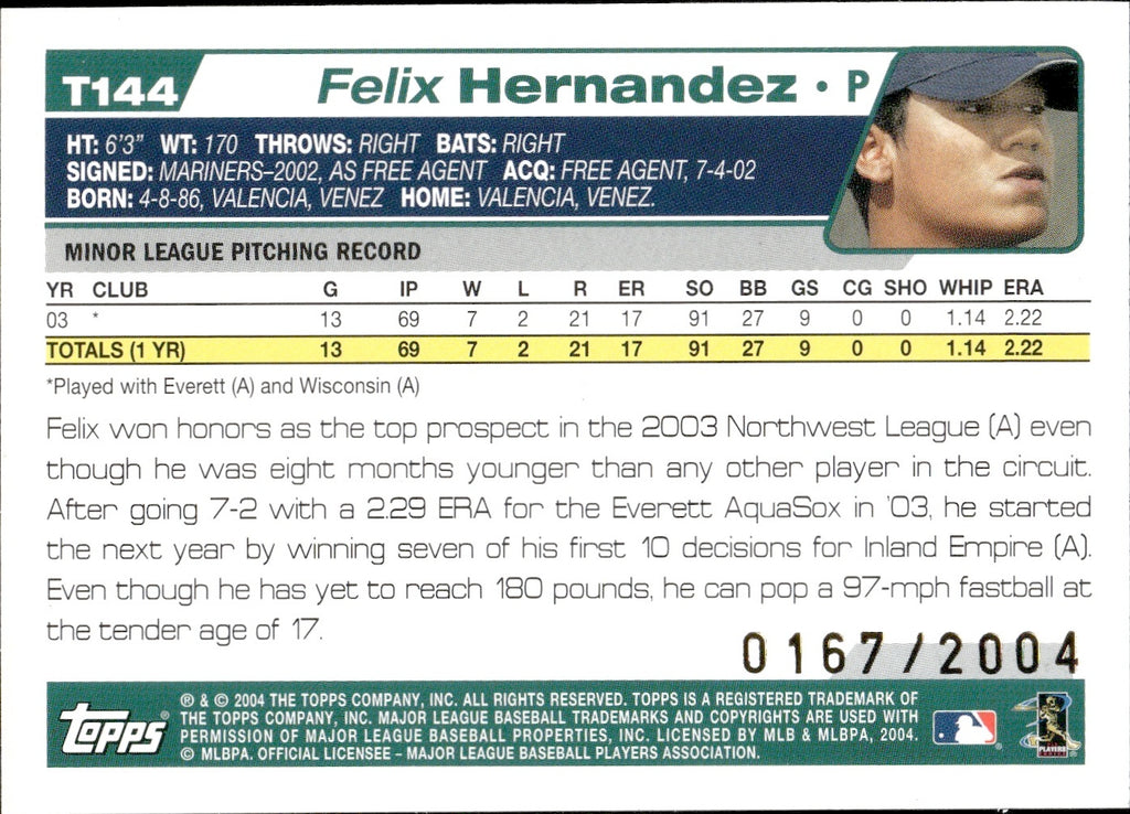 2004 Felix Hernandez Topps GOLD ROOKIE 0167/2004 RC #T144 Seattle Mariners