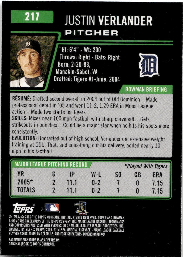 2005 Justin Verlander Bowman Chrome ROOKIE RC #217 Detroit Tigers 2