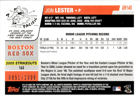 2006 Jon Lester Topps Update GOLD BORDER ROOKIE 0951/2006 RC #UH149 Boston Red Sox