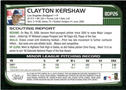 2008 Clayton Kershaw Bowman Draft ROOKIE RC #BDP26 Los Angeles Dodgers 1
