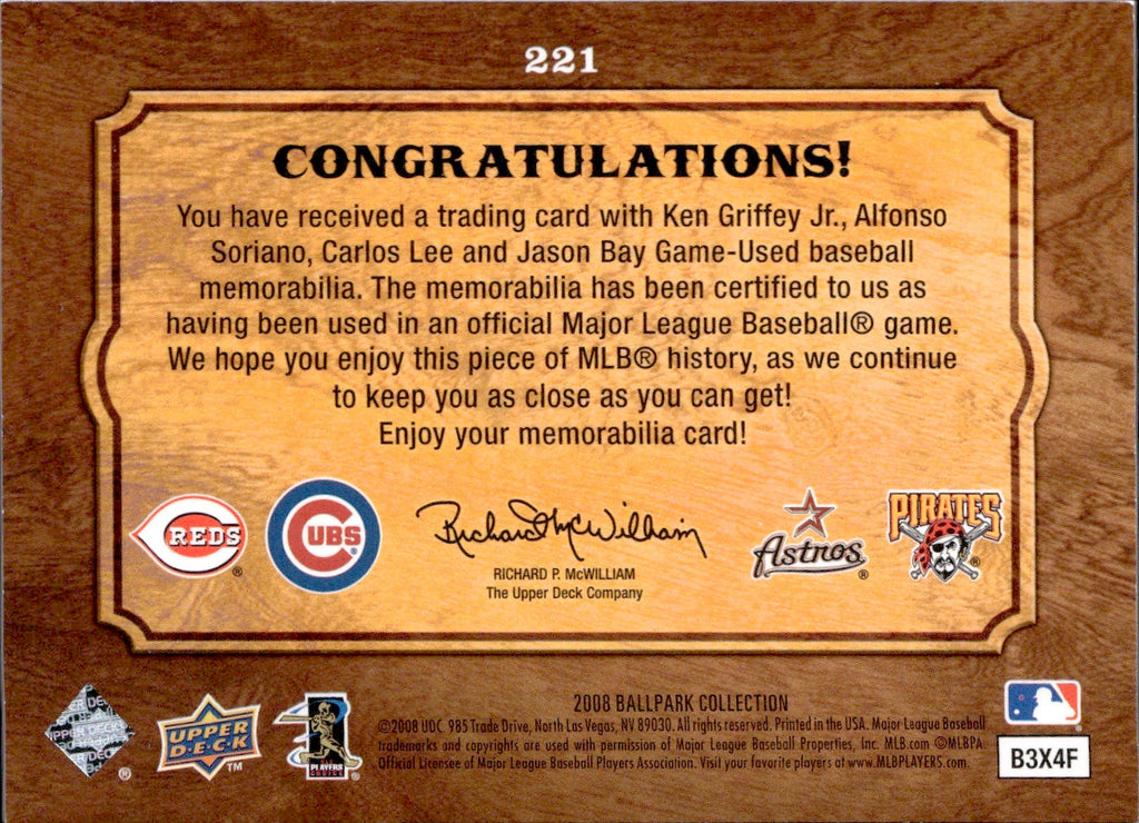 2008 Ken Griffey Jr. Alfonso Soriano Carlos Lee Jason Bay Upper Deck Ballpark Collection QUAD SWATCH MEMORABILIA GAME-USED JERSEYS #221 Cincinnati Reds Chicago Cubs Houston Astros Pittsburgh Pirates