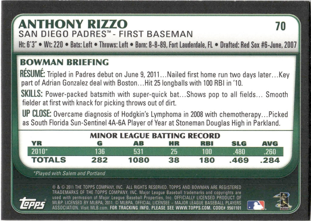 2011 Anthony Rizzo Bowman GOLD BORDER ROOKIE RC #70 San Diego Padres
