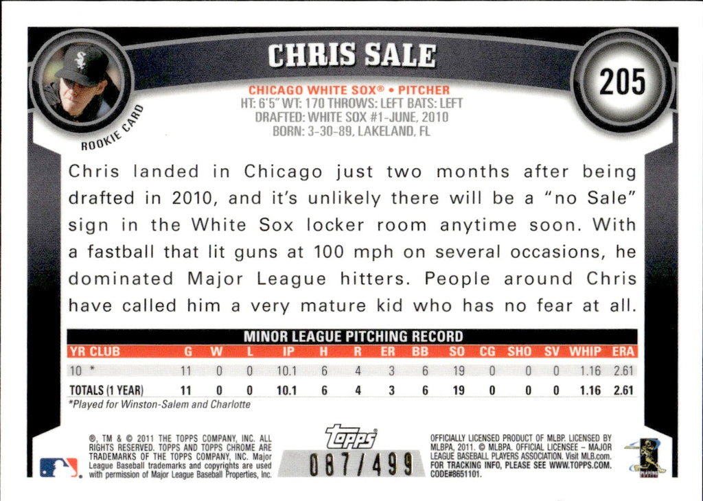 2011 Chris Sale Topps Chrome PURPLE REFRACTOR ROOKIE RC 87/499 #205 Chicago White Sox