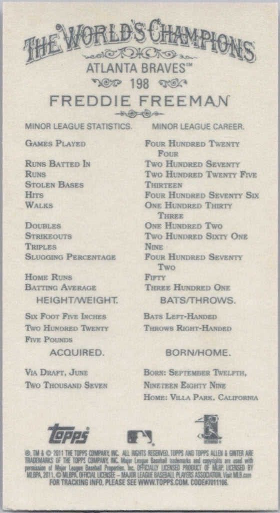2011 Freddie Freeman Topps Allen & Ginter MINI BLACK BORDER ROOKIE RC #198 Atlanta Braves