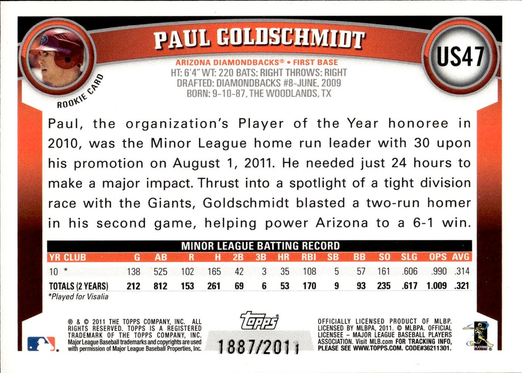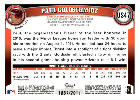 2011 Paul Goldschmidt Topps Update GOLD BORDER ROOKIE RC 1887/2011 #US47 Arizona Diamondbacks