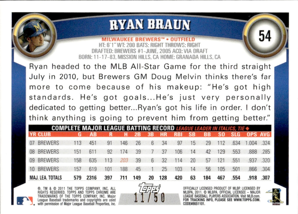 2011 Ryan Braun Topps Chrome GOLD REFRACTOR 11/50 #54 Milwaukee Brewers