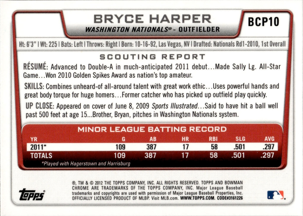 2012 Bryce Harper Bowman Chrome PROPECTS #BCP10 Washington Nationals 2