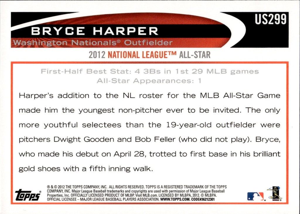 2012 Bryce Harper Topps Update Series SP PHOTO VARIATION #US299 Washington Nationals
