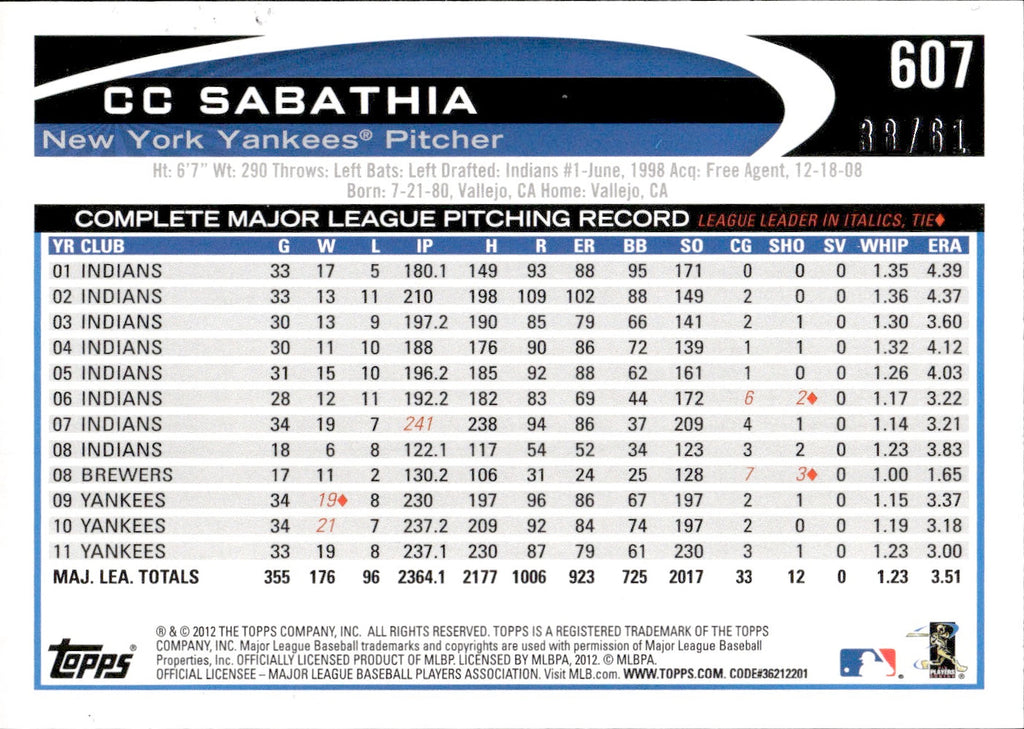 2012 CC Sabathia Topps BLACK 38/61 #607 New York Yankees