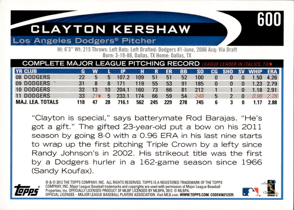 2012 Clayton Kershaw Topps SP BROOKLYN DODGERS UNIFORM VARIATION #600 Los Angeles Dodgers