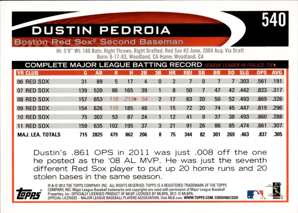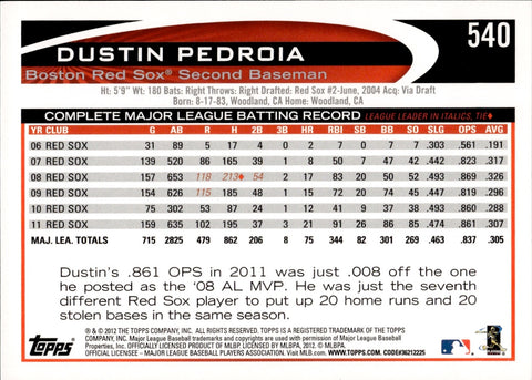 2012 Dustin Pedroia Topps SP VARIATON FLAG IN BACKGROUND #540B Boston Red Sox