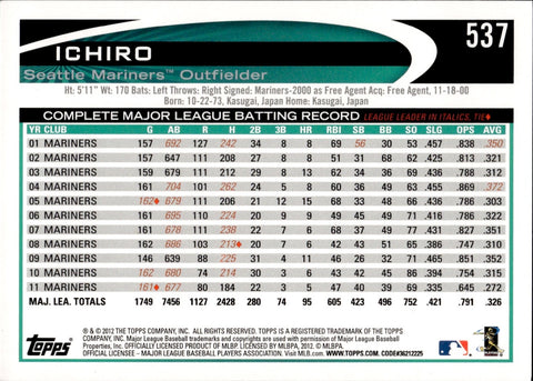 2012 Ichiro Suzuki Topps SP PHOTO VARIATION #537 Seattle Mariners HOF