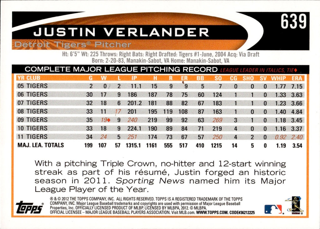2012 Justin Verlander Topps SP NO HITTER BASEBALLS IN HAND VARIATION #639 Detroit Tigers