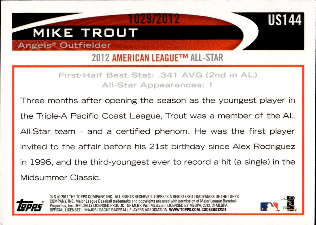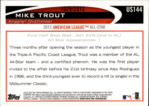 2012 Mike Trout Topps Update Series GOLD BORDER ALL-STAR 1029/2012 #US144 Anaheim Angels
