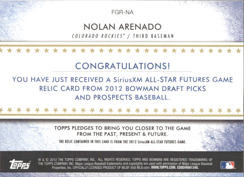 2012 Nolan Arenado Bowman Draft Picks & Prospects ALL-STAR FUTURES GAME-WORN JERSEY RELIC 44/199 #FGR-NA Colorado Rockies