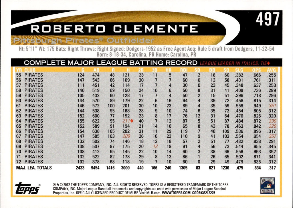 2012 Roberto Clemente Topps SP LEGENDS VARIATION #497 Pittsburgh Pirates HOF