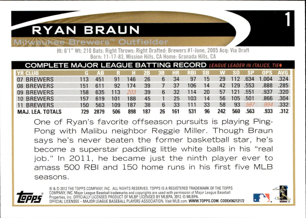 2012 Ryan Braun Topps BREWERS CELEBRATING SP PHOTO VARIATION #1 Milwaukee Brewers