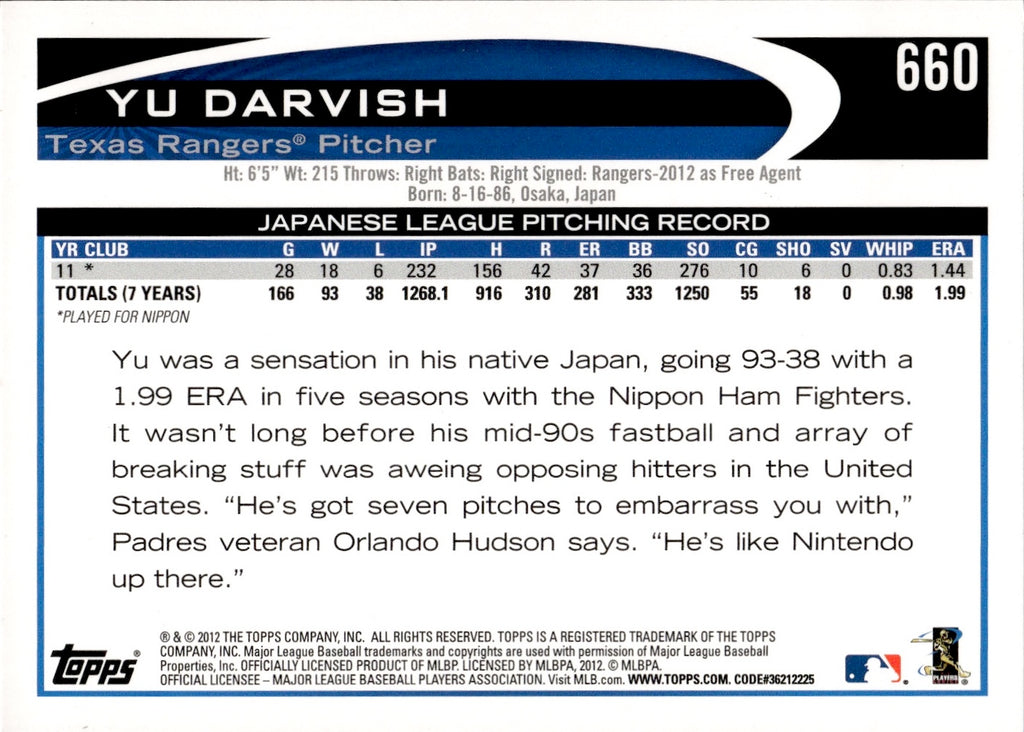 2012 Yu Darvish Topps ROOKIE SP PHOTO VARIATION RC #660 Texas Rangers