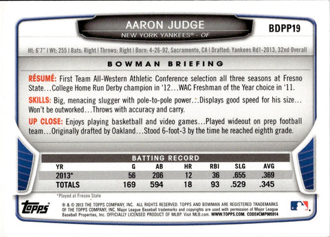 2013 Aaron Judge Bowman ROOKIE RC #BDPP19 New York Yankees 11