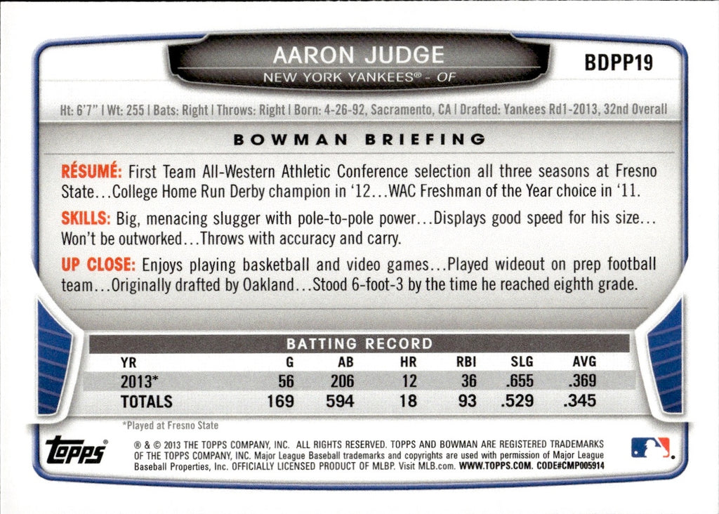 2013 Aaron Judge Bowman ROOKIE RC #BDPP19 New York Yankees 6