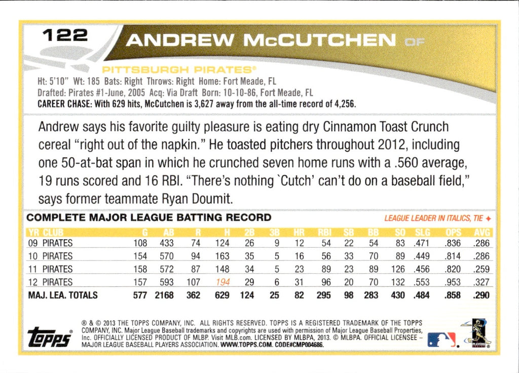 2013 Andrew McCutchen Topps SP SUNGLASSES VARIATION #122 Pittsburgh Pirates