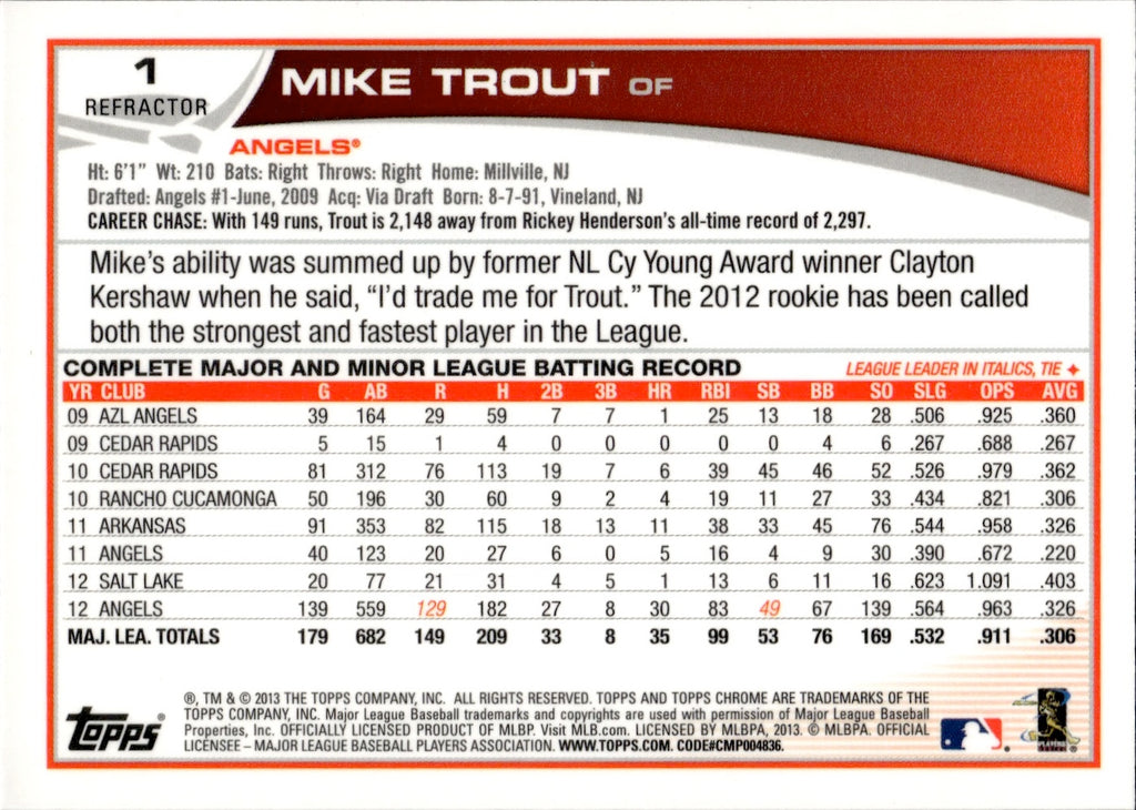 2013 Mike Trout Topps Chrome SLIDING RETAIL ORANGE REFRACTOR #1 Anaheim Angels