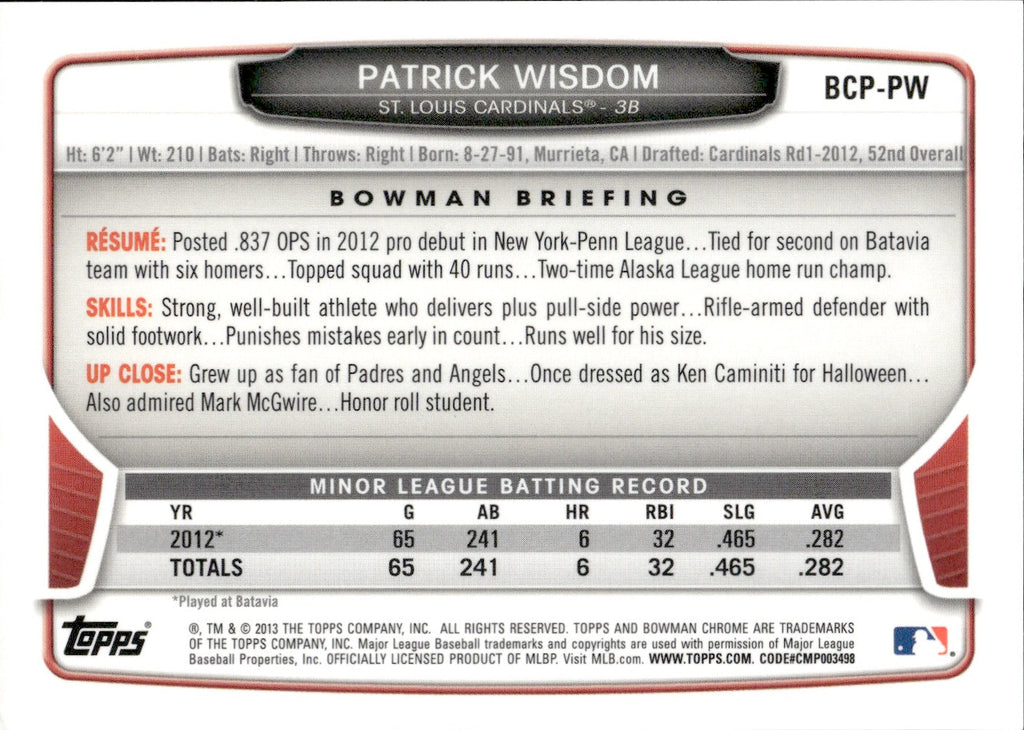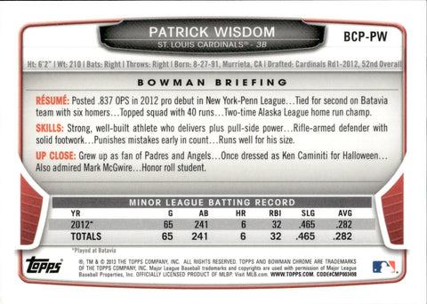 2013 Patrick Wisdom Bowman Chrome Prospect AUTOGRAPH ROOKIE AUTO RC #BCP-PW St. Louis Cardinals