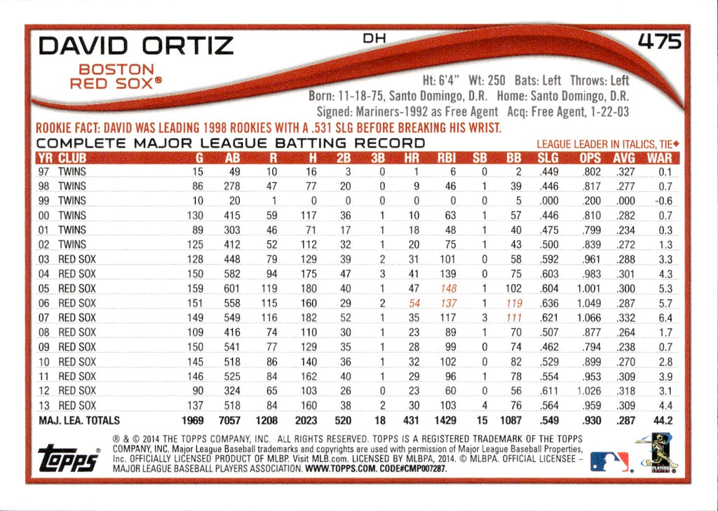 2014 David Ortiz Topps SKI GOGGLES CELEBRATION SP PHOTO VARIATION #475 Boston Red Sox
