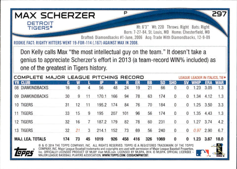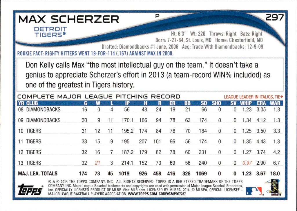 2014 Max Scherzer Topps GOOGLES CELEBRATION SP PHOTO VARIATION #297 Detroit Tigers