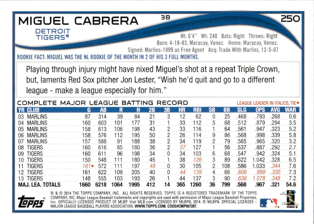 2014 Miguel Cabrera Topps WEARING HOODIE SP PHOTO VARIATION #250 Detroit Tigers