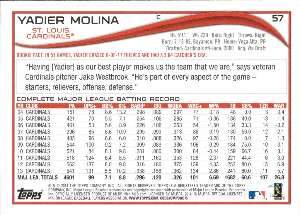 2014 Yadier Molina Topps SABERMETRIC STATS SP SHORT PRINT #57 St. Louis Cardinals
