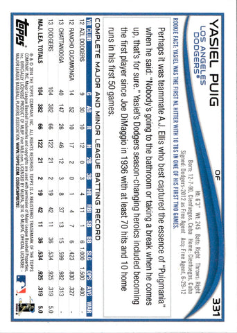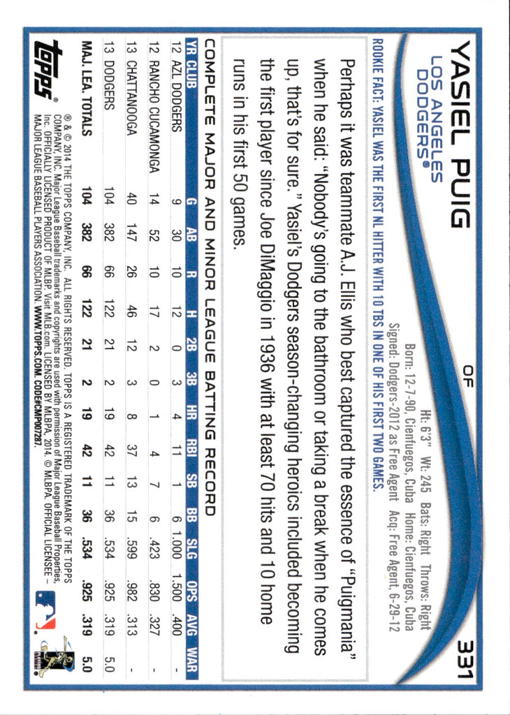 2014 Yasiel Puig Topps FUTURE STARS SP PHOTO VARIATION #331 Los Angeles Dodgers