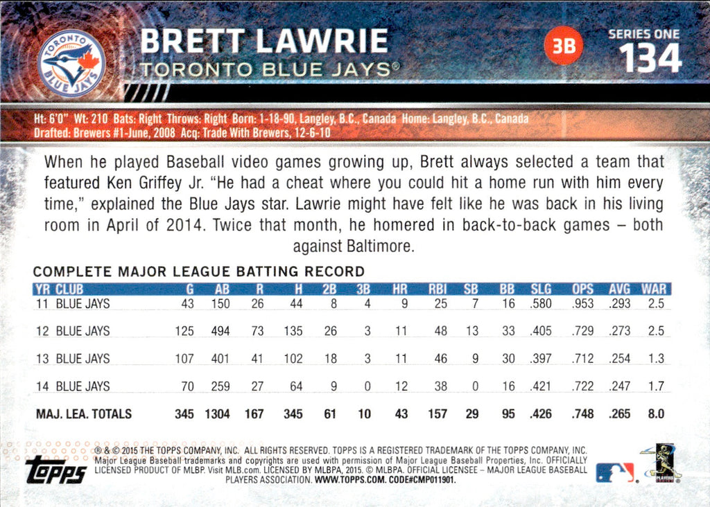 2015 Brett Lawrie Topps SERIES 1 JUGGLING IN DUGOUT SP PHOTO VARIATION #134 Toronto Blue Jays