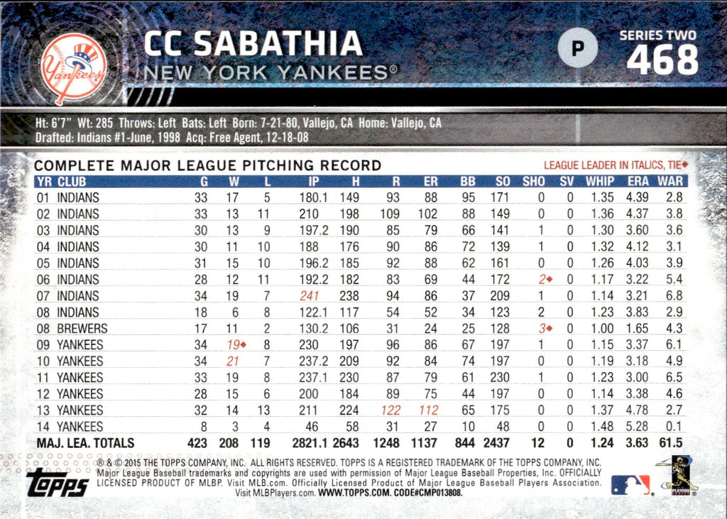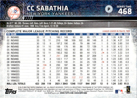 2015 CC Sabathia Topps SERIES 2 WITH DEREK JETER SP PHOTO VARIATION #468 New York Yankees