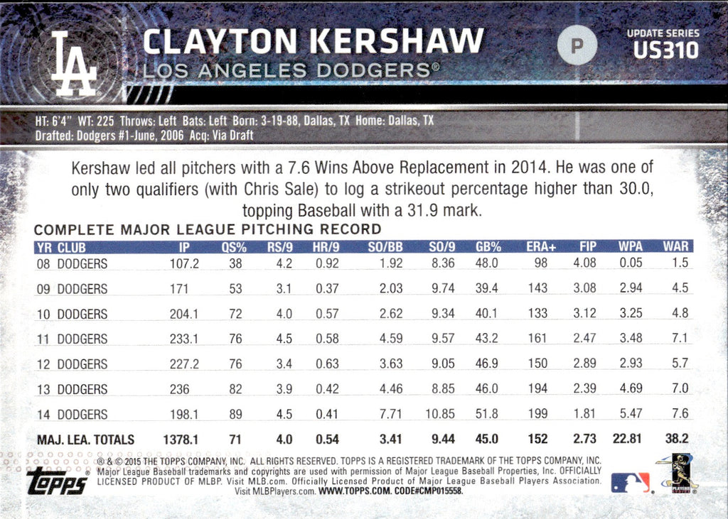 2015 Clayton Kershaw Topps Update SABERMETRIC STATS SP SHORT PRINT #US310 Los Angeles Dodgers