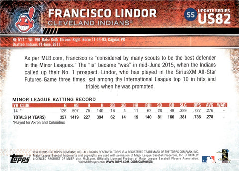 2015 Francisco Lindor Topps Update Series ROOKIE RC #US82 Cleveland Indians 2