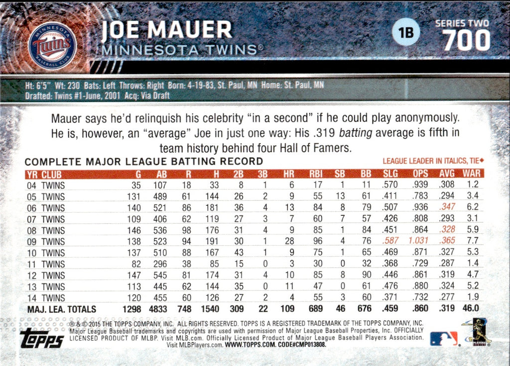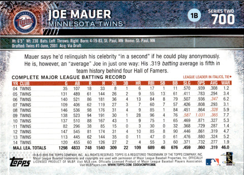 2015 Joe Mauer Topps Series 2 SP IN DUGOUT VARIATION #700 Minnesota Twins HOF