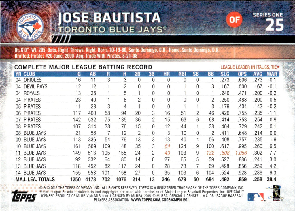 2015 Jose Bautista Topps SERIES 1 LOOKING OVER SHOULDER SP PHOTO VARIATION #25 Toronto Blue Jays