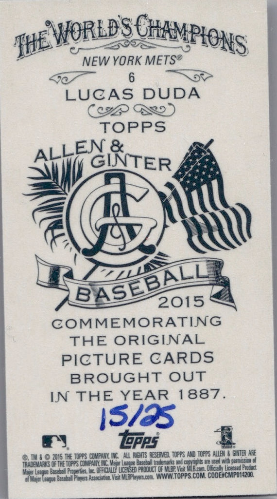 2015 Lucas Duda Topps Allen & Ginter MINI GINTER BACK HAND NUMBERED 15/25 #6 New York Mets