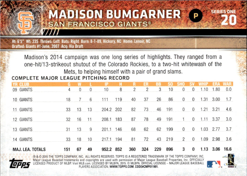 2015 Madison Bumgarner Topps SERIES 1 BATTING SP PHOTO VARIATION #20 San Francisco Giants