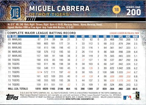 2015 Miguel Cabrera Topps SERIES 1 WEARING SUNGLASSES SP PHOTO VARIATION #200 Detroit Tigers