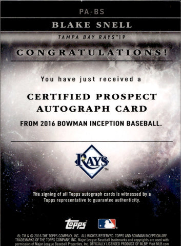 2016 Blake Snell Bowman Inception CERTIFIED PROSPECT AUTO AUTOGRAPH #PA-BS Tampa Bay Rays