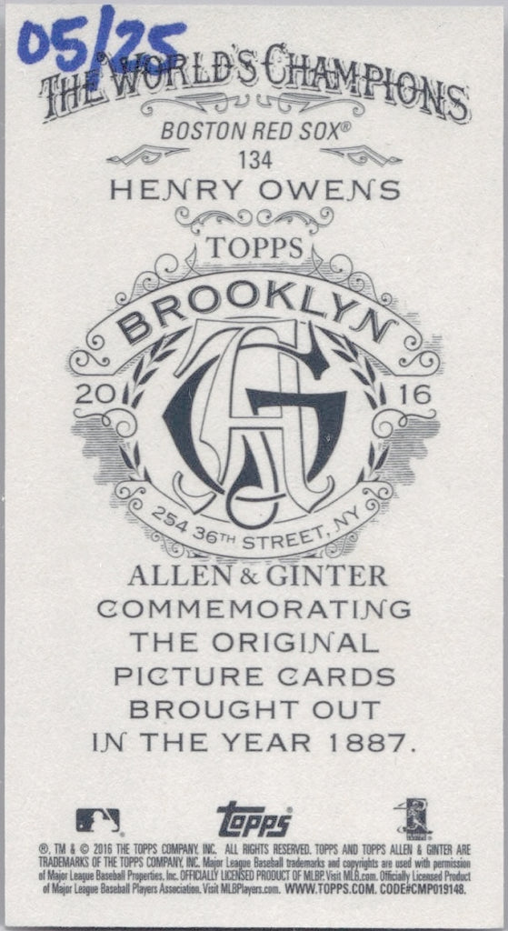 2016 Henry Owens Topps Allen & Ginter MINI BROOKLYN BACK HAND NUMBERED 5/25 #134 Boston Red Sox