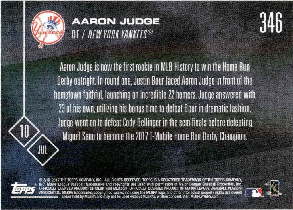 2017 Aaron Judge Topps NOW HOME RUN DERBY WINNER ROOKIE RC #346 New York Yankees